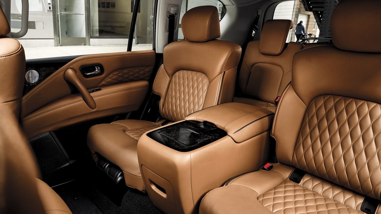 Интерьер Инфинити QX80 поражает удивительно стильной и гармоничной отделкой дорогим материалами. Эргономика идеальна, массивная панель, поразительное изобилие удобных кнопок, роскошные дисплеи. Максимум удобств обеспечено для пассажиров второго ряда. При этом на третьем ряду также много пространства для вольготного расположения трех человек.